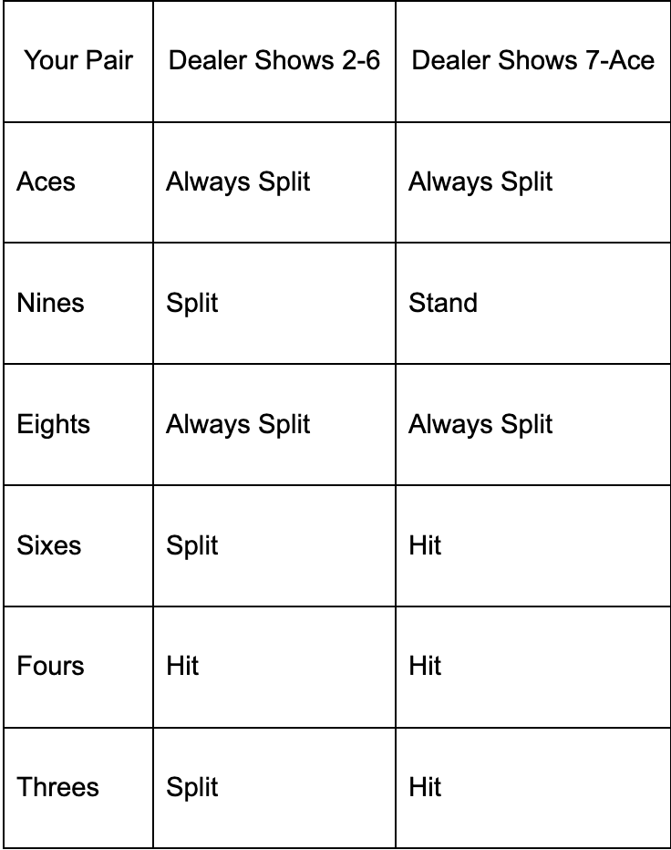 Pair splitting decisions follow mathematical expectations. Always split aces and eights. Never split fives or tens. Split other pairs based on dealer’s showing card. The table below shows optimal splitting decisions: