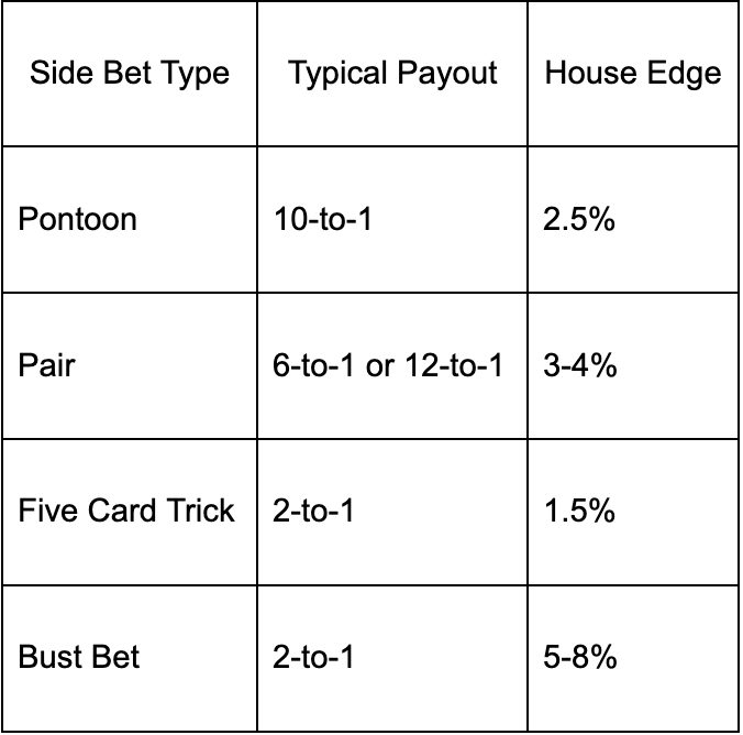 Pontoon packs optional side bets on specific outcomes. These include bets on whether the player receives a pontoon, whether the player beats the dealer, or specific card combinations. The following table shows typical side bet house edges: