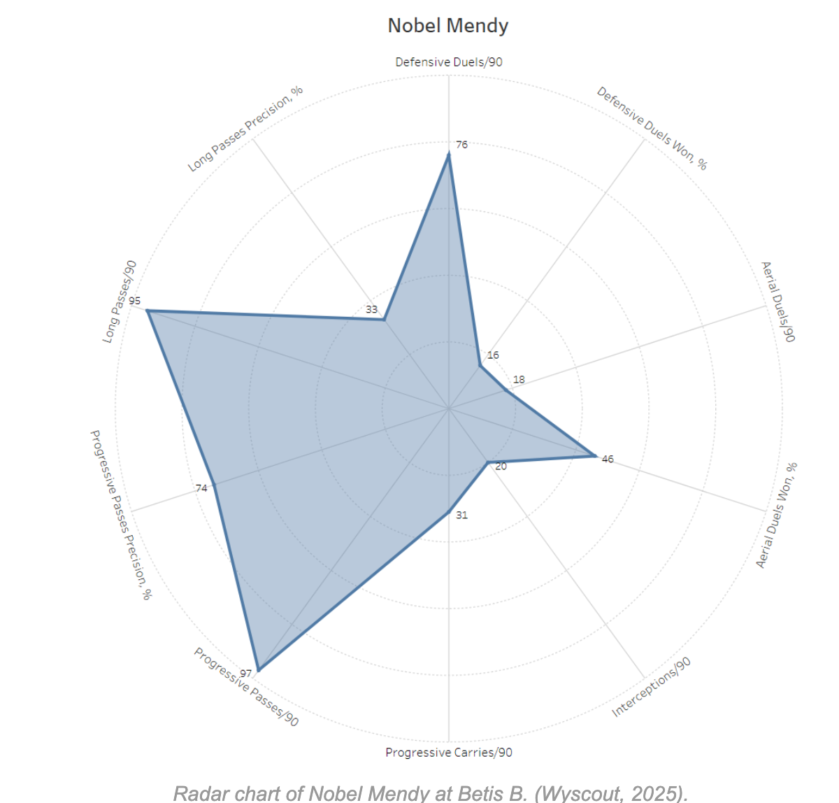 In this chart, we can observe that Mendy is an excellent progressor of the ball, ranking high in progressive passes per 90 with a very good precision considering his volume. In addition, he ranks highly for long passes per 90, though his precision is quite low.
