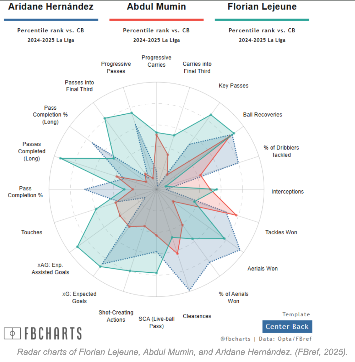 This can also be seen with Aridane in his aerial wins and clearances, which shows he is a player who is strong in duels; meanwhile, Lejeune is a more conservative center back.