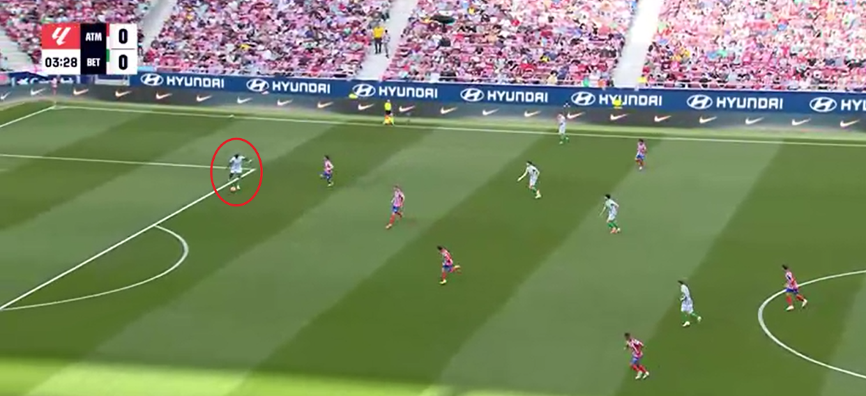 The video footage is of him playing in the first division, as he played in the last few games, but the data is from his matches in the 3rd division. When I saw him play, it is easy to see that he likes to attempt many long balls to the wingers, either down the same line or a diagonal, however, his timing of these is usually quite poor. Nonetheless, his ability to play these balls is very good, like in this image, however, he needs to know when and when not to attempt these passes.